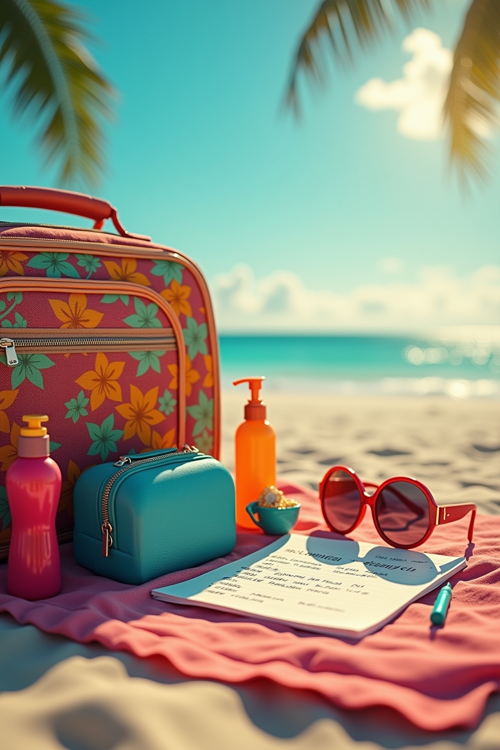 Wichtige Sommerurlaub-Essentials: Sonnenschutz (LSF 30+), Reiseapotheke mit individuellen Medikamenten, Reisedokumente und Kopien