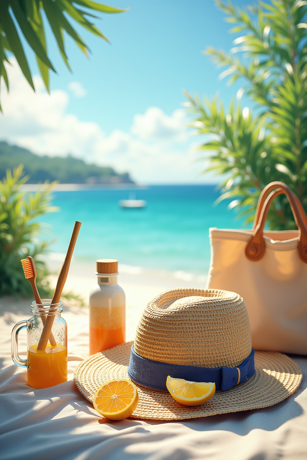Strandurlaub: Sonnenschutz mit LSF 30+, Badetasche mit Handtüchern, luftige Kleidung und Flip-Flops