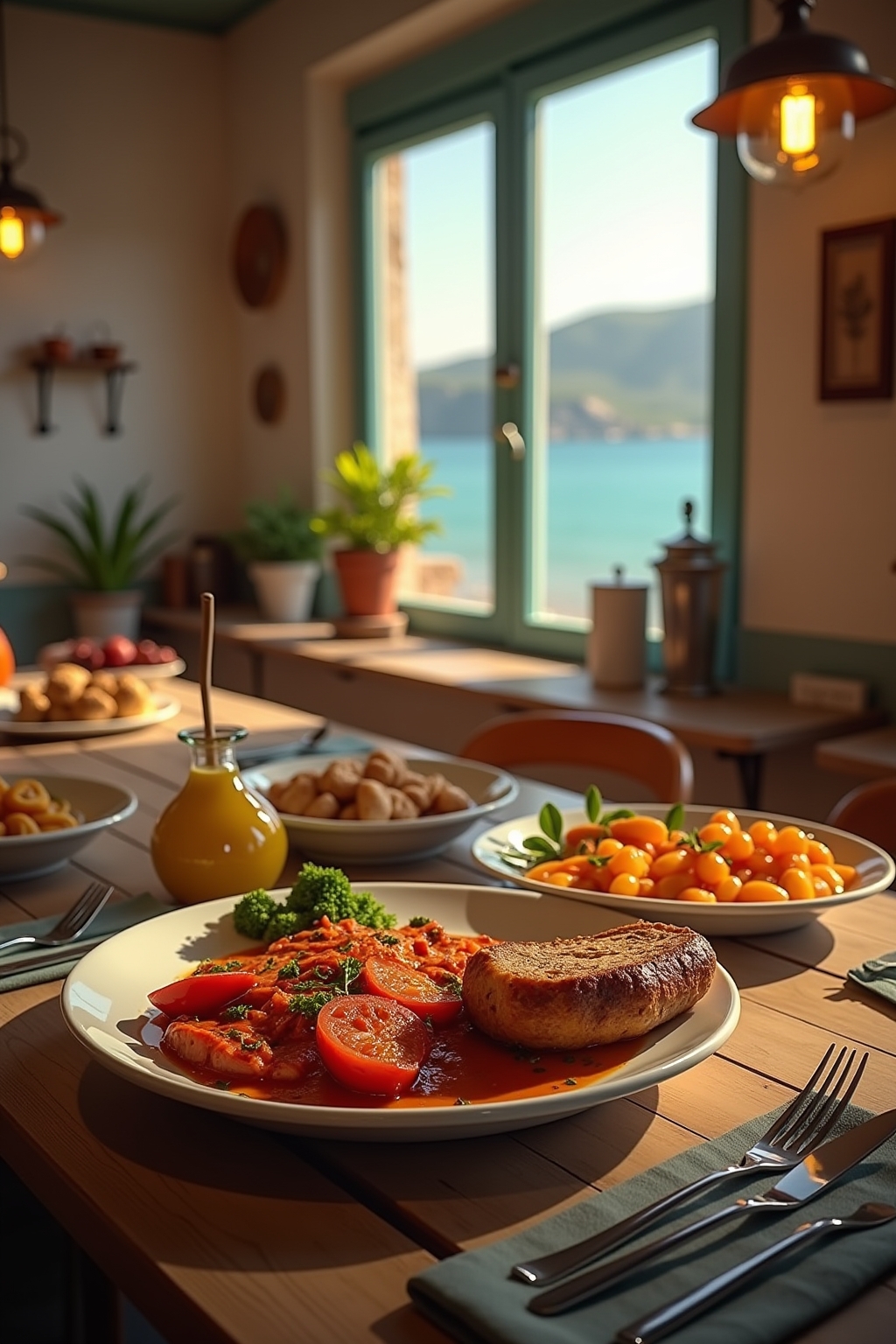 • Frische Meeresfrüchte und traditionelle griechische Gerichte dominieren die Speisekarten der Küstentavernen.